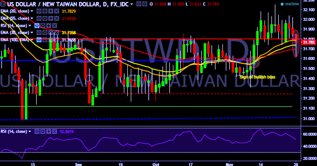 We prefer to go short on USD/TWD around 31.80, stop loss at 31.95 and target of 31.62/31.54.