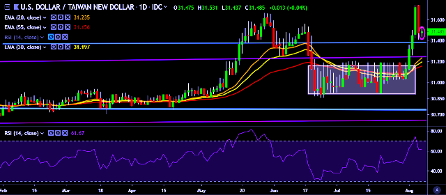 We prefer to take short position on USD/TWD only below 31.40, stop loss at 31.65 and target of 30.89.
