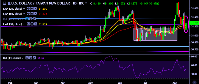 We prefer to take long position on USD/TWD only above 31.40, stop loss at 31.10 and target of 31.90.
