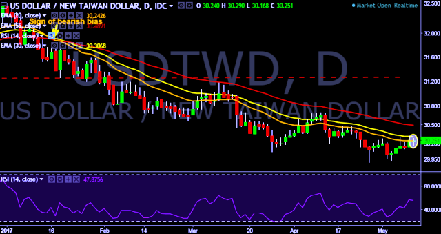 We prefer to take long position in USD/TWD around 30.22, stop loss at 30.15 and target of 30.32/30.40.