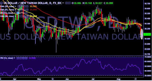 We prefer to take short position in USD/TWD around 30.12 mark, stop loss at 30.30 and target of 29.72.
