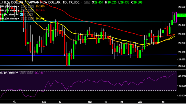 We prefer to take long position on USD/TWD around 29.47, stop loss 29.30 and target of 29.65.
