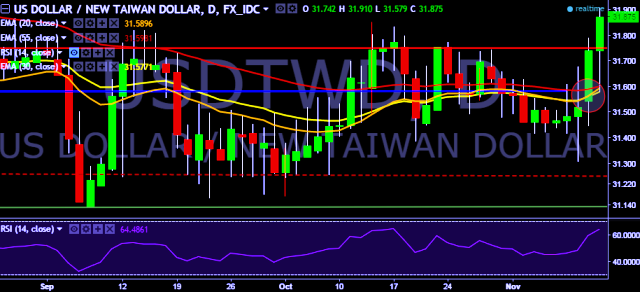 We prefer to go long on USD/TWD around 31.80, stop loss 31.50 and target of 32.18/32.43.