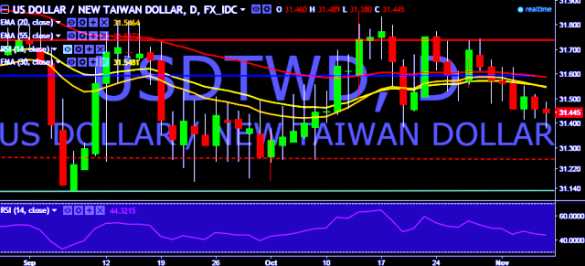 We prefer to go short on USD/TWD around 31.45, stop loss 31.55 and target of 31.38/31.26.
