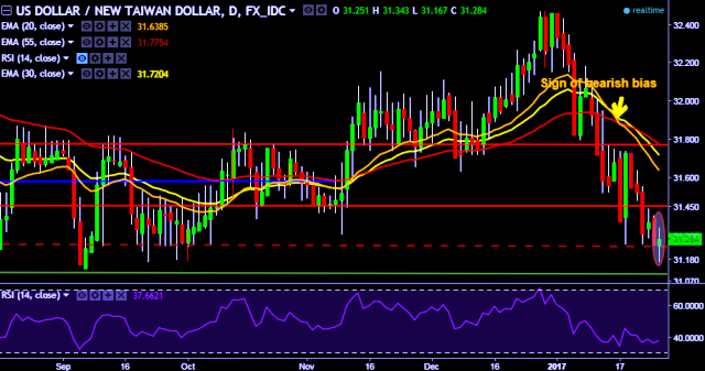 We prefer to take short position in USD/TWD around 31.30, stop loss 31.44 and target 30.99/30.85.