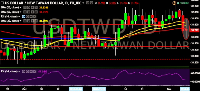 We prefer to go short on USD/TWD around 31.70, stop loss 31.90 and target of 31.45.