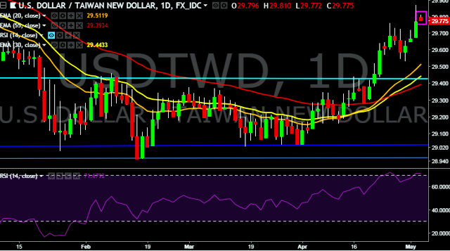 We prefer to take long position on USD/TWD only above 29.81, stop loss 29.67 and target of 30.02/30.22.