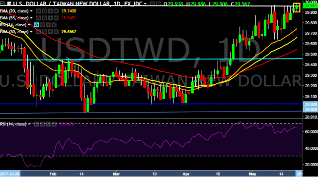 We prefer to take long position on USD/TWD only above 30.02, stop loss 29.80 and target of 30.22/30.50.