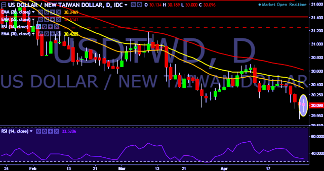 We prefer to take short position in USD/TWD only below 29.90, stop loss at 30.27 and target of 29.76/29.61.