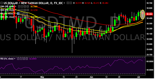 We prefer to take long position in USD/TWD around 30.45, stop loss at 30.35 and target of 30.90.