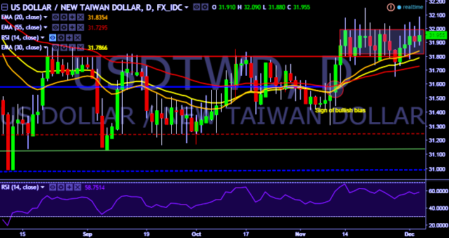 We prefer to go long on USD/TWD around 31.92, stop loss at 31.77 and target of 32.09/32.20.