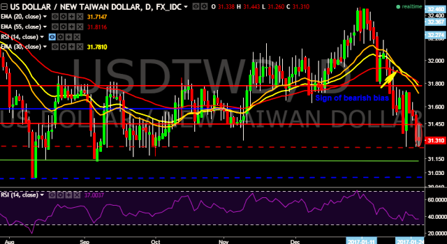 We prefer to take short position in USD/TWD only below 31.25, stop loss 31.55 and target 31.13/30.99/30.85.