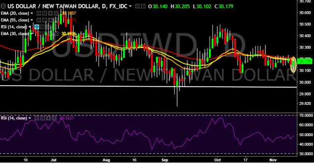 We prefer to take long position on USD/TWD only above 30.22, stop loss at 30.08 and target of 30.50 mark.