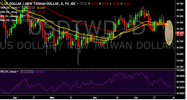 We prefer to take short position in USD/TWD around 30.28, stop loss 30.50 and target of 29.90.