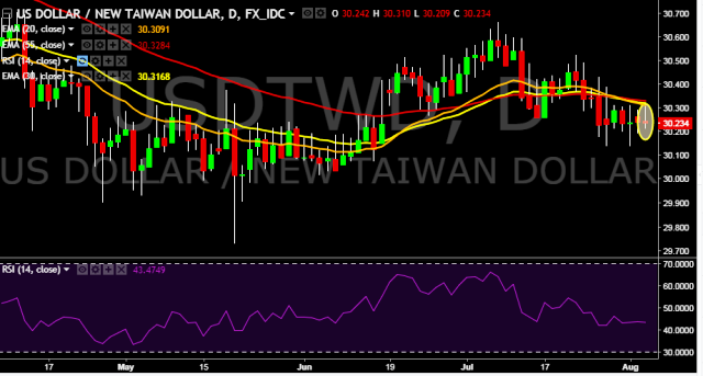 We prefer to take short position in USD/TWD only below 30.13 mark, stop loss at 30.40 and target of 29.84.