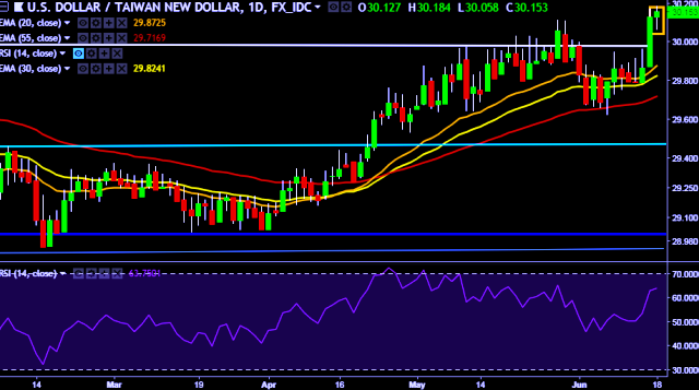 We prefer to take long position on USD/TWD around 30.10, stop loss at 30.00 and target of 30.38.
