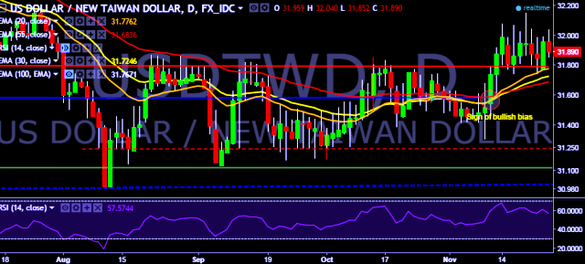 We prefer to go long on USD/TWD only above 32.08, stop loss 31.77 and target of 32.18/32.43.
