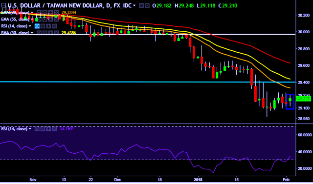 We prefer to take long position in USD/TWD only above 29.32, stop loss at 29.08 and target of 29.50/29.90.