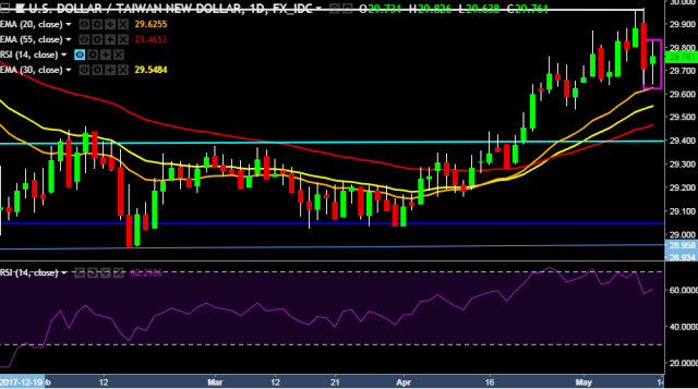 We prefer to take long position on USD/TWD around 29.70, stop loss 29.50 and target of 30.02/30.22.