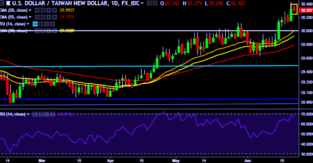 We prefer to take long position on USD/TWD only above 30.38, stop loss at 30.10 and target of 30.90.