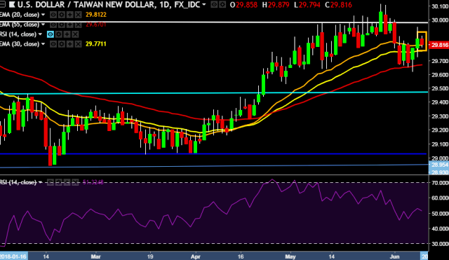 We prefer to take long position on USD/TWD around 29.80, stop loss 30.68 and target of 29.90/30.02.