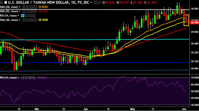 We prefer to take short position on USD/TWD around 29.80, stop loss 30.02 and target of 29.50.