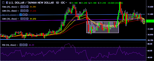 We prefer to take short position on USD/TWD only below 31.17, stop loss at 31.42 and target of 30.89/30.68.