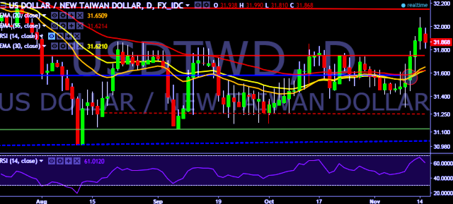 We prefer to go long on USD/TWD only above 31.99, stop loss 31.80 and target of 32.08/32.18/32.43.