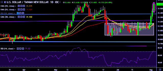 We prefer to take long position on USD/TWD around 31.55, stop loss at 31.12 and target of 31.90/32.12.