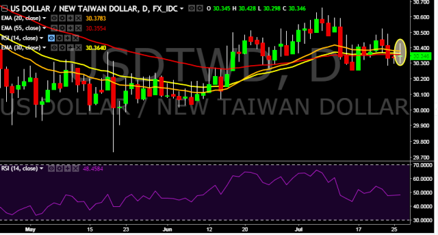 We prefer to take long position in USD/TWD only above 30.50, stop loss 30.25 and target of 30.90.