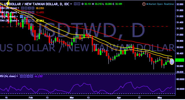 We prefer to take long position in USD/TWD only above 30.22, stop loss at 30.05 and target of 30.40.