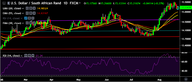 We prefer to take short position on USD/ZAR around 15.25, stop loss at 15.40 and target of 15.02/14.94.