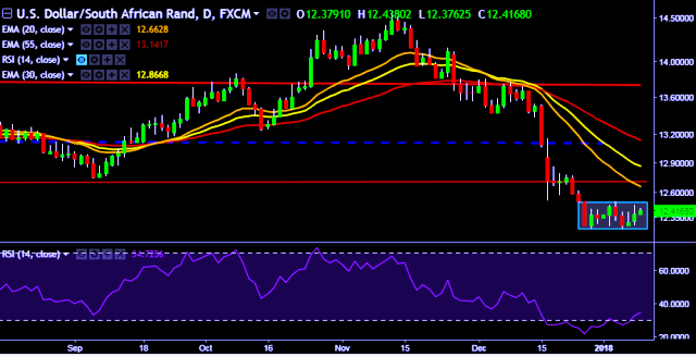 We prefer to take long position on USD/ZAR only above 12.50, stop loss 12.20 and target of 12.90 mark.