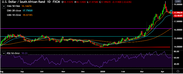 We prefer to take long position on USD/ZAR only above 18.20, stop loss at 17.90 and target of 18.40.
