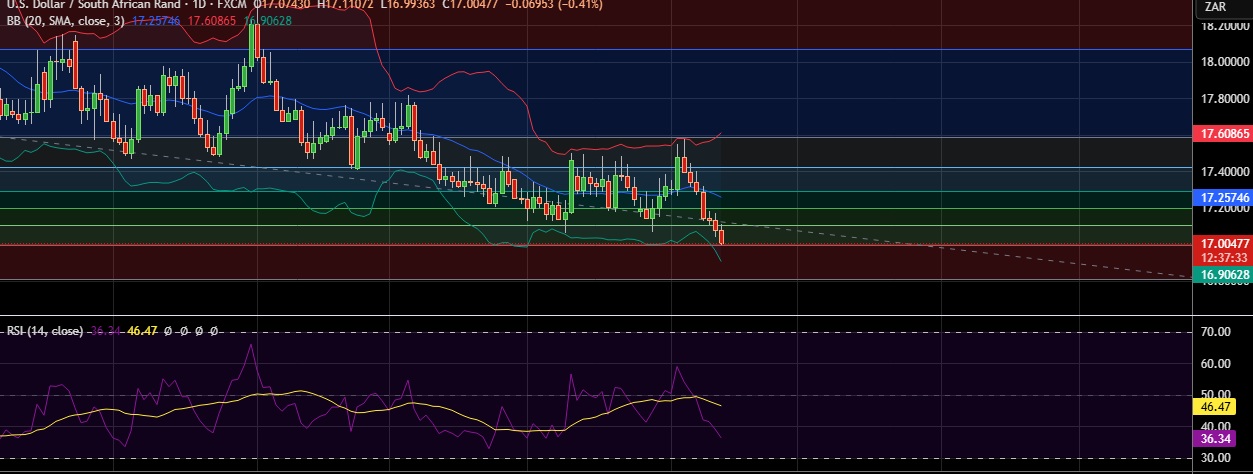 • At GMT 09:20,the dollar was down 0.42% at 16.970 against South African rand .