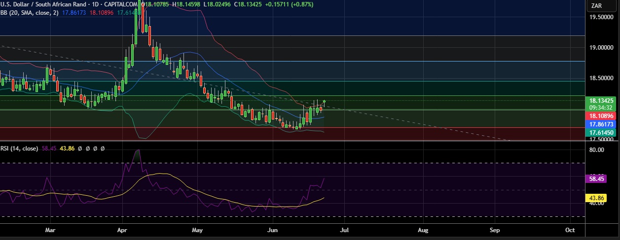 • USD/ZAR trading near one-week high on Monday as U.S. attacks on Iran intensified geopolitical uncertainty and dampened risk appetite.