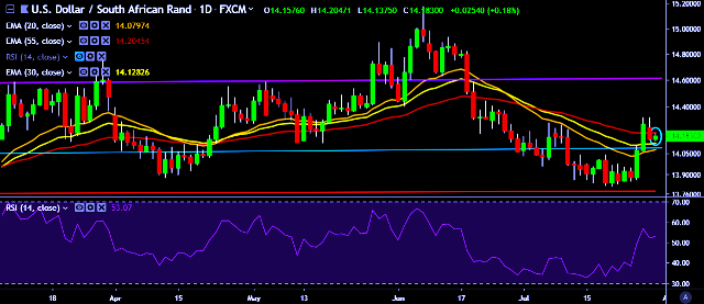 We prefer to take short position on USD/ZAR only below 14.11, stop loss at 14.25 and target of 14.02/13.90.