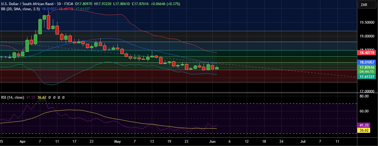 • The USD/ZAR edged higher on Tuesday as South African rand weakened after first-quarter gross domestic product (GDP) data came in marginally better than expected.