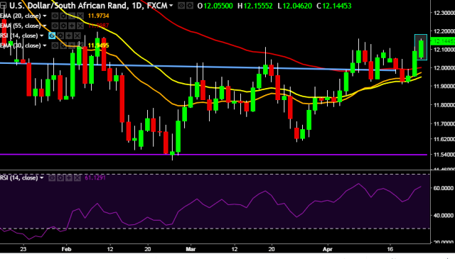 We prefer to take long position on USD/ZAR around 12.10, stop loss at 11.94 and target of 12.45.