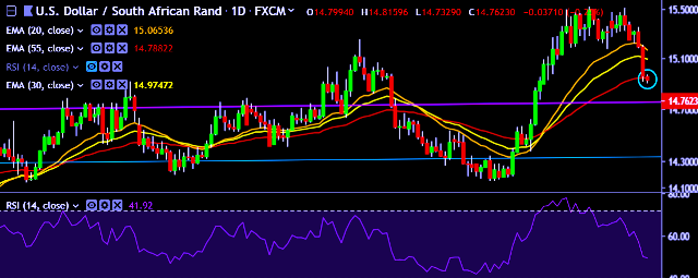 We prefer to take short position on USD/ZAR only below 14.72, stop loss at 14.94 and target of 14.5714.27//14.05.