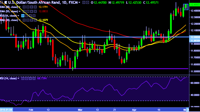 We prefer to take long position on USD/ZAR around 12.47, stop loss at 12.40 and target of 12.90.