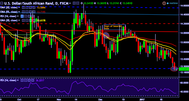 We prefer to take short position in USD/ZAR only below 13.22, stop loss at 13.39 and taget of 13.01.