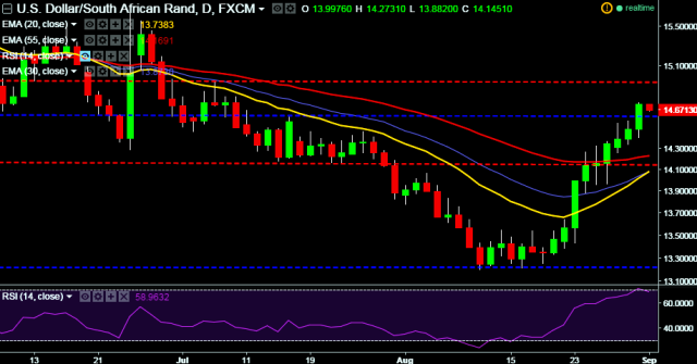 We prefer to go long on USD/ZAR only above 14.74, stop loss at 14.33 and target of 14.96/15.28.