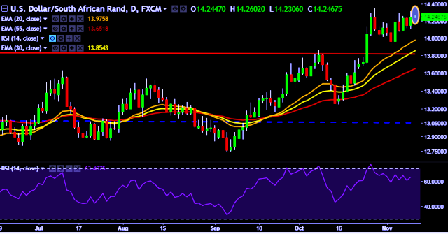 We prefer to take long position on USD/ZAR around 14.24, stop loss 14.07 and target of 14.49 mark.