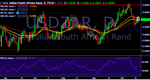 We prefer to take short position on USD/ZAR only below 13.38, stop loss 13.50 and target of 13.18/13.01.