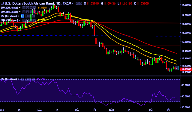 We prefer to take short position on USD/ZAR only below 11.65, stop loss at 11.78 and target of 11.24.