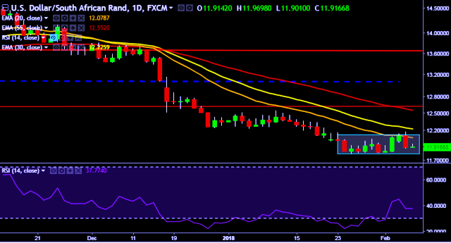 We prefer to take short position on USD/ZAR only below 11.82, stop loss at 12.02 and target of 11.55.