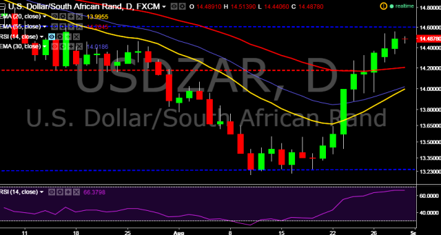 We prefer to go short on USD/ZAR only below 14.37, stop loss at 14.56 and target of 13.88.