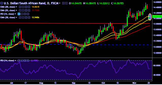 We prefer to take long position on USD/ZAR around 14.05, stop loss 13.94 and target of 14.23/14.32 mark.