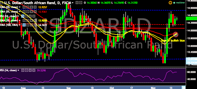 We prefer to go long on USD/ZAR only above 14.38, stop loss 14.11 and target of 14.75.